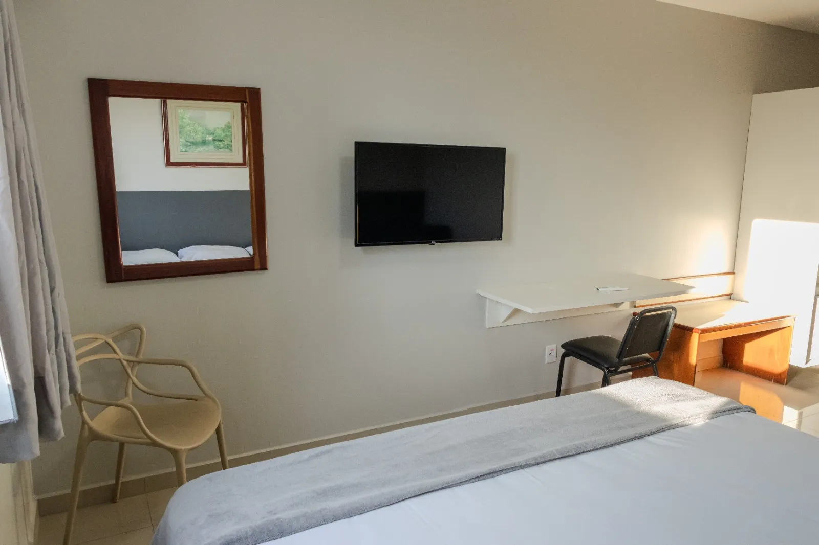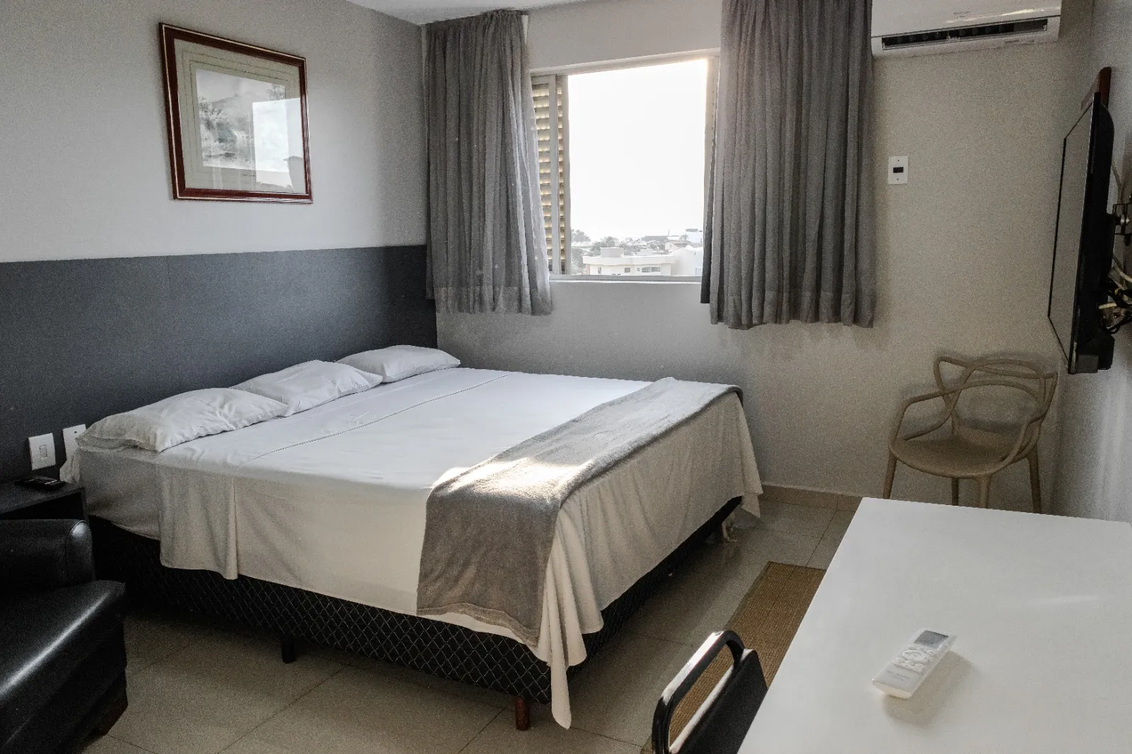 O quarto King Double, é ideal para casais e viagens individuais, para quem gosta de conforto e mais espaço, temos sete quartos disponíveis nesta categoria, localizados no quarto e quinto andar.